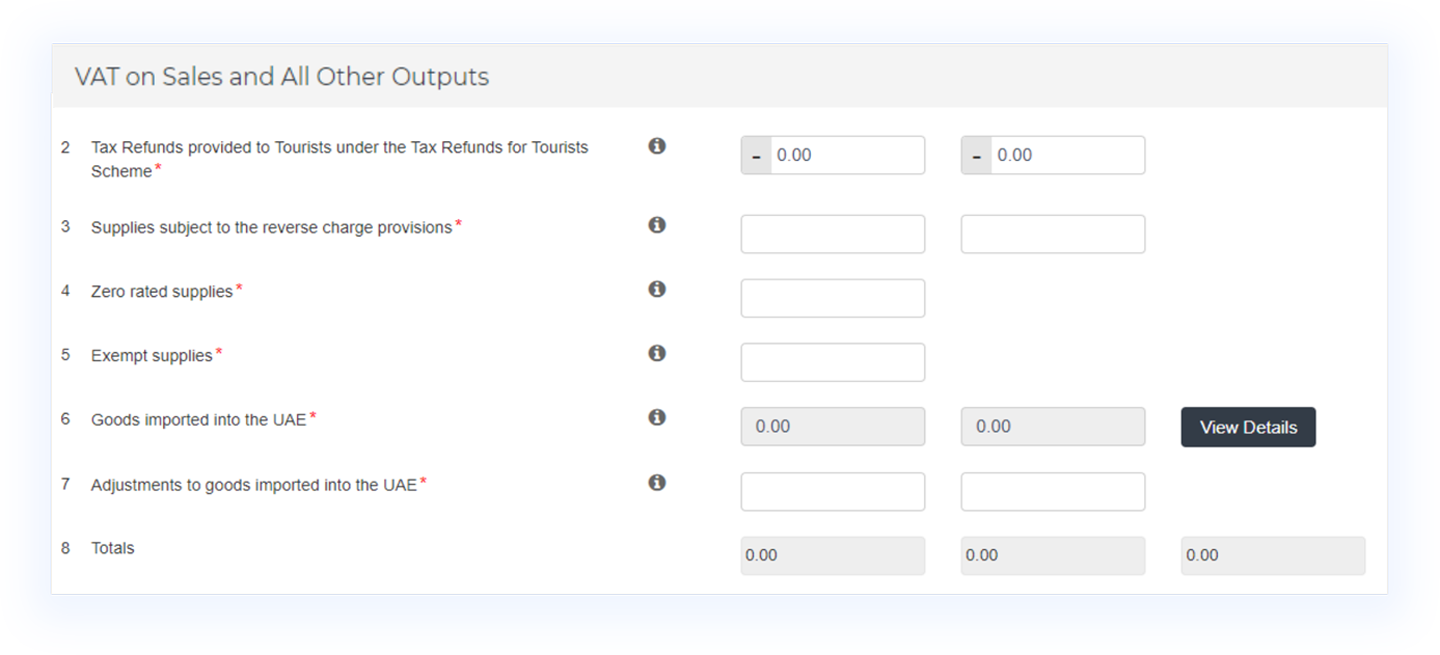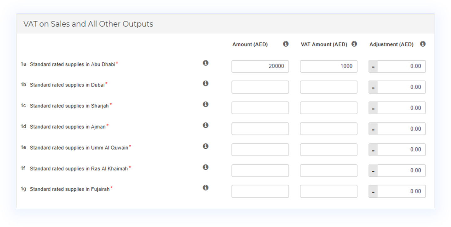 Box 1 - Standard Rated Supplies: Captures the sale of all goods and services sold or supplied within the UAE with 5% VAT. There is a subsection for each emirate, in which you are required to capture the sales you have made to customers located there and the VAT collected from that emirate.