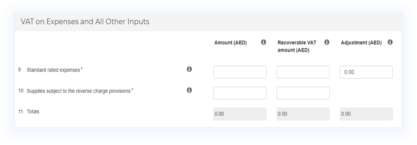 Box 9 - Standard-rated expenses: These boxes capture all of your purchases on which you paid 5% VAT. This includes any recoverable VAT that you paid for a purchase made in another GCC country that also implements VAT.