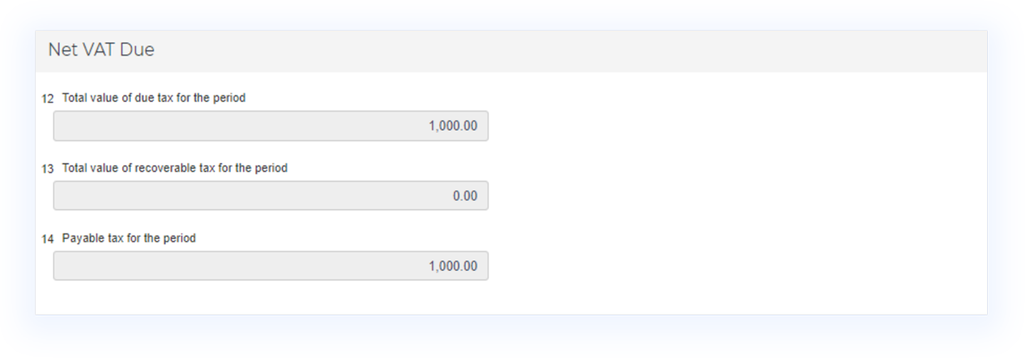 Box 14 - Payable tax for the period: Box 14 calculates the total value of payable tax for the tax period by deducting the value in box 13 from the value in box 12.
