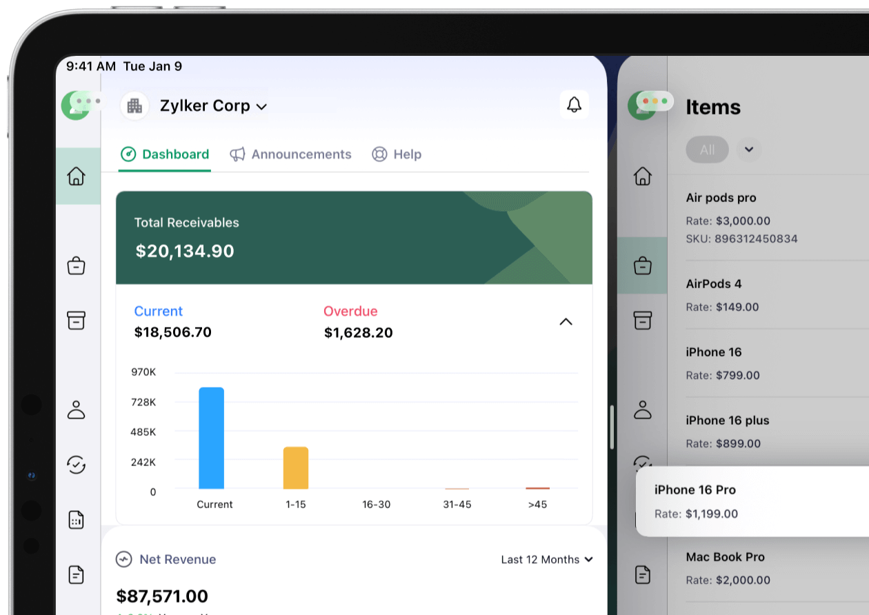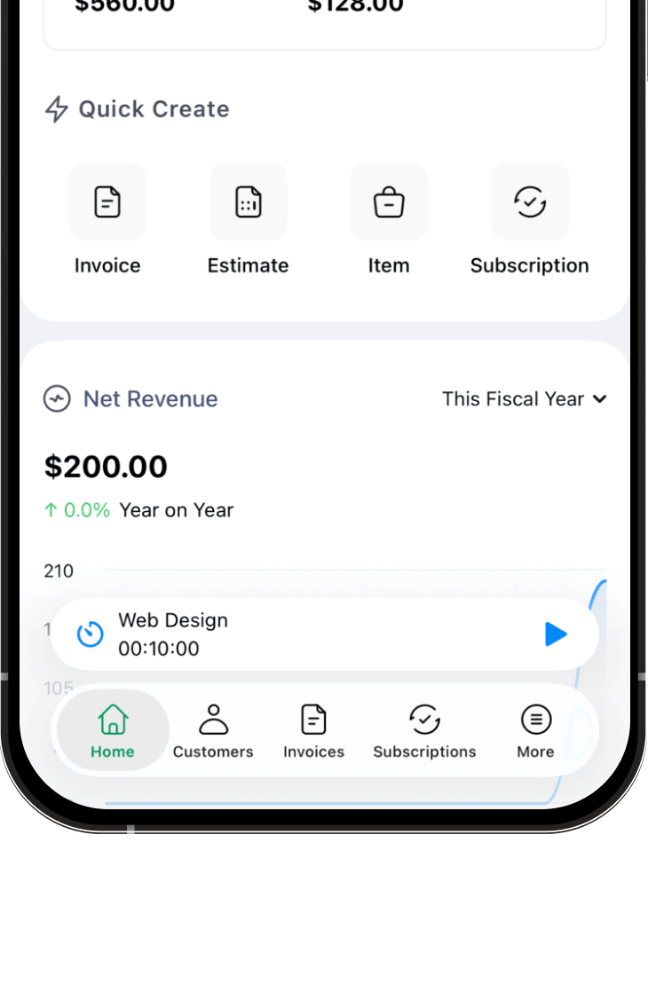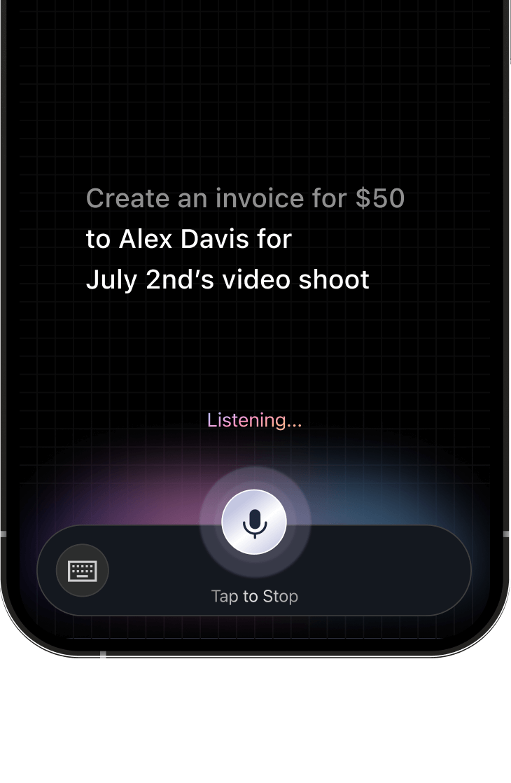 Skip the forms and speak your invoice into existence. Just say, "Create an invoice for $50 to Alex Davis for July 2nd's video shoot," and it's already on the way, thanks to seamless voice support via Zia and Siri.