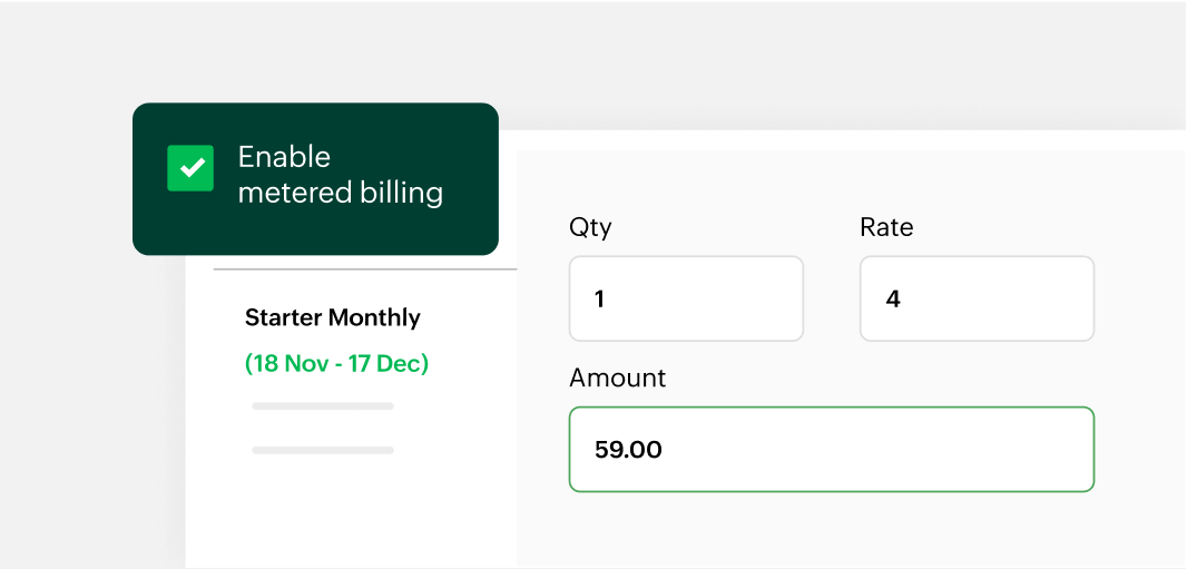 • Track the usage of products and services and calculate prices based on total consumption using Zoho Billing. The usage-based pricing model helps your business address the requirements of a diverse market since customers only pay for what they use. It also helps your business understand how customers are using your services and adapt accordingly.
