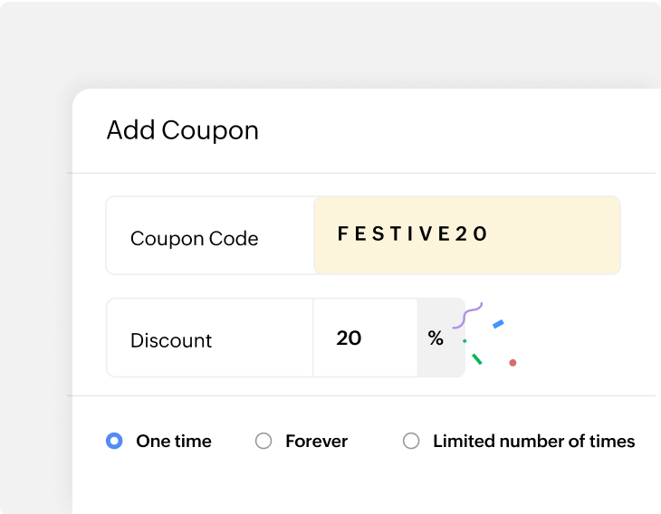 Offer flat or percentage discounts to your customers, set up maximum redemptions, and associate coupons to only relevant products using Zoho Billing.