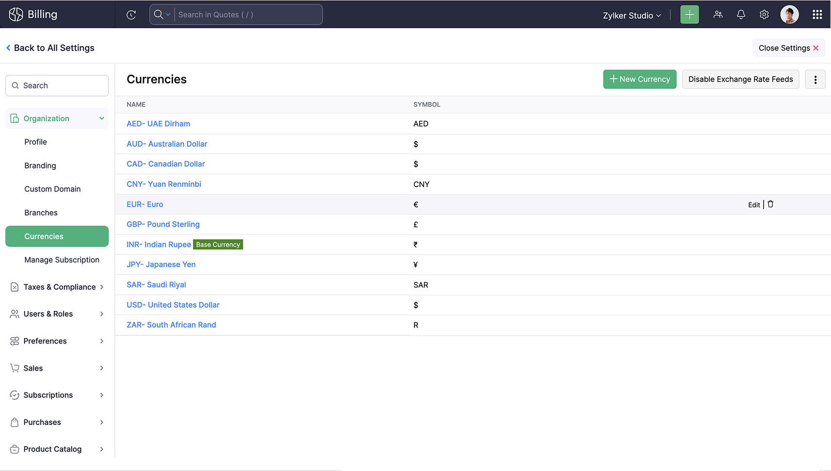Zoho Billing also allows you to manually configure exchange rates by disabling the "exchange rate" option.
