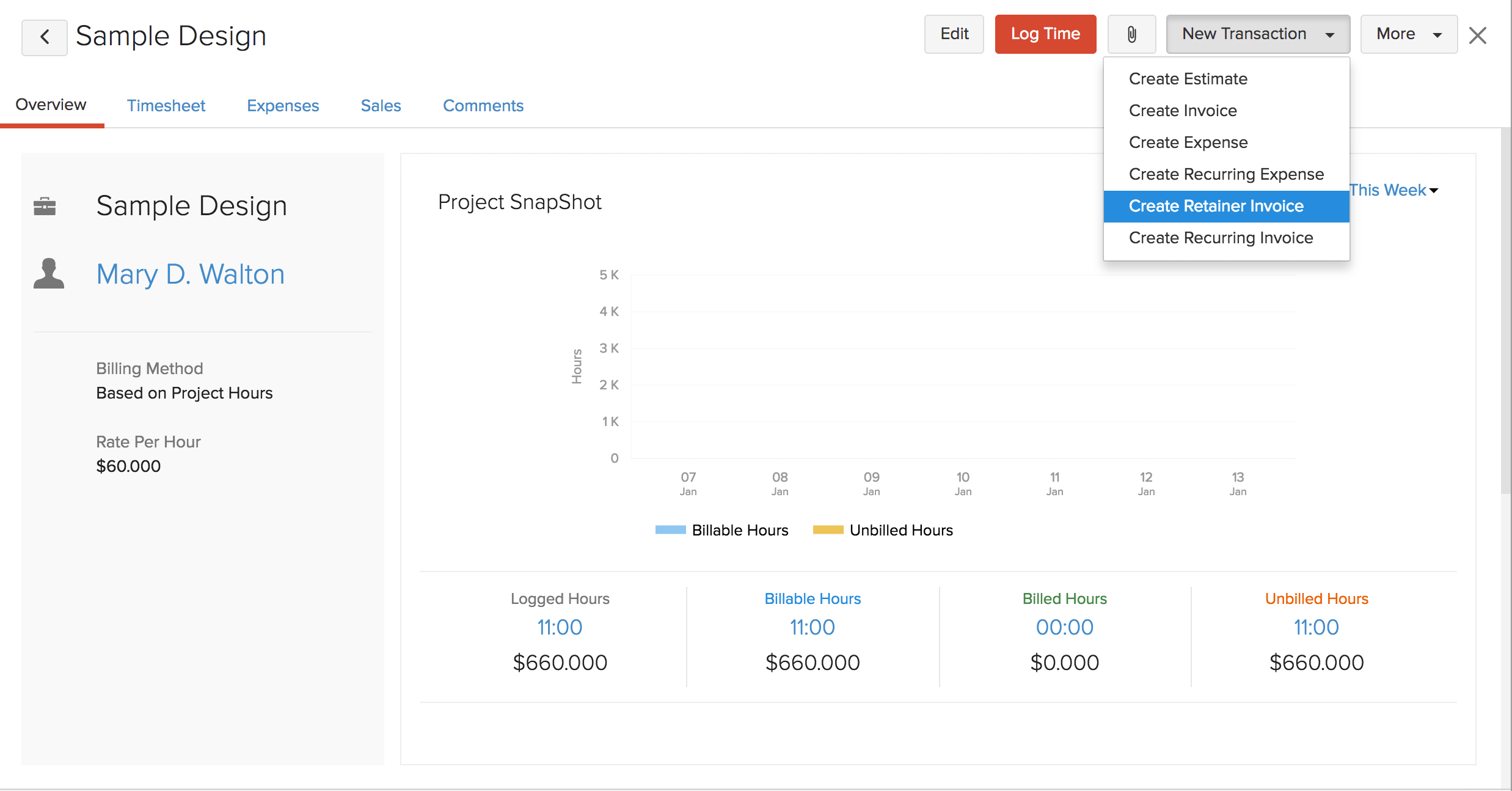 If would you be working on the same project for the same amount of hours again and again, then you can make this recurring so that invoice would be generated automatically in the fixed time interval without you having to manually raise it every time.