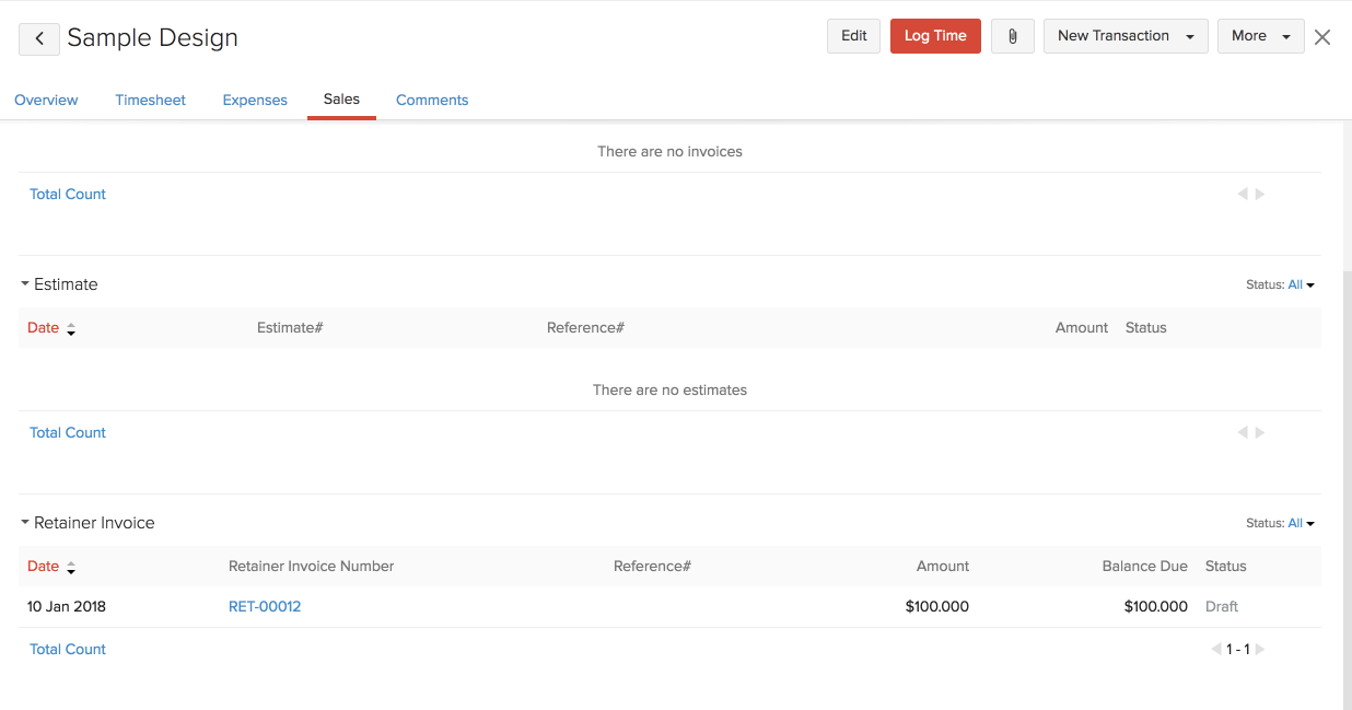 - This retainer invoice created can be seen inside your project dashboard from the Transactions tab by clicking on Filter by and selecting Retainer Invoices from the drop-down.