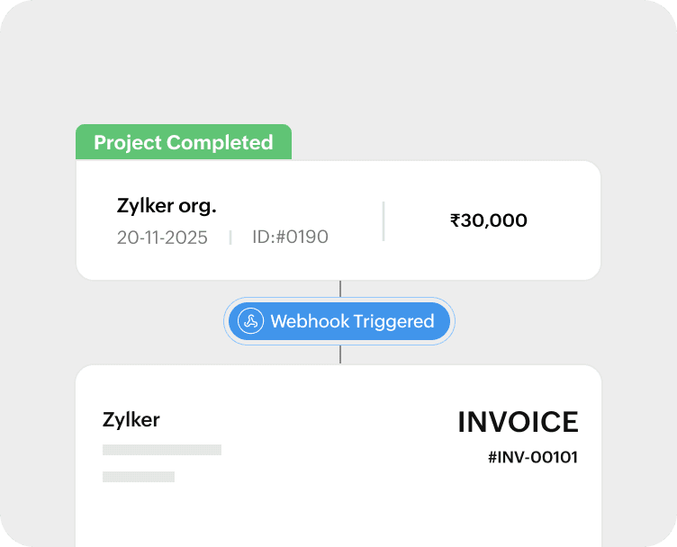 Automate actions inside Zoho Books based on triggers from an external application. For instance, generate invoices on Zoho Books based automatically when an item is marked complete on another external project management tool.