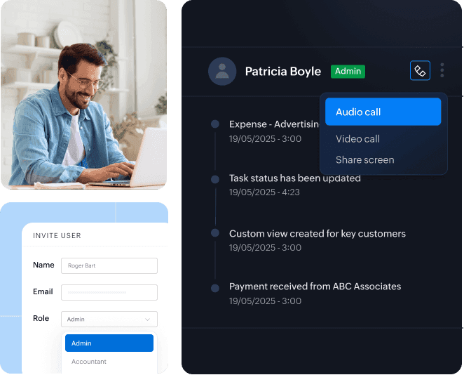 Invite multiple users, including accountants, to Zoho Books. Offer your customers and vendors dedicated self-service portals. Enjoy simplified and secure collaboration with Zoho Books.