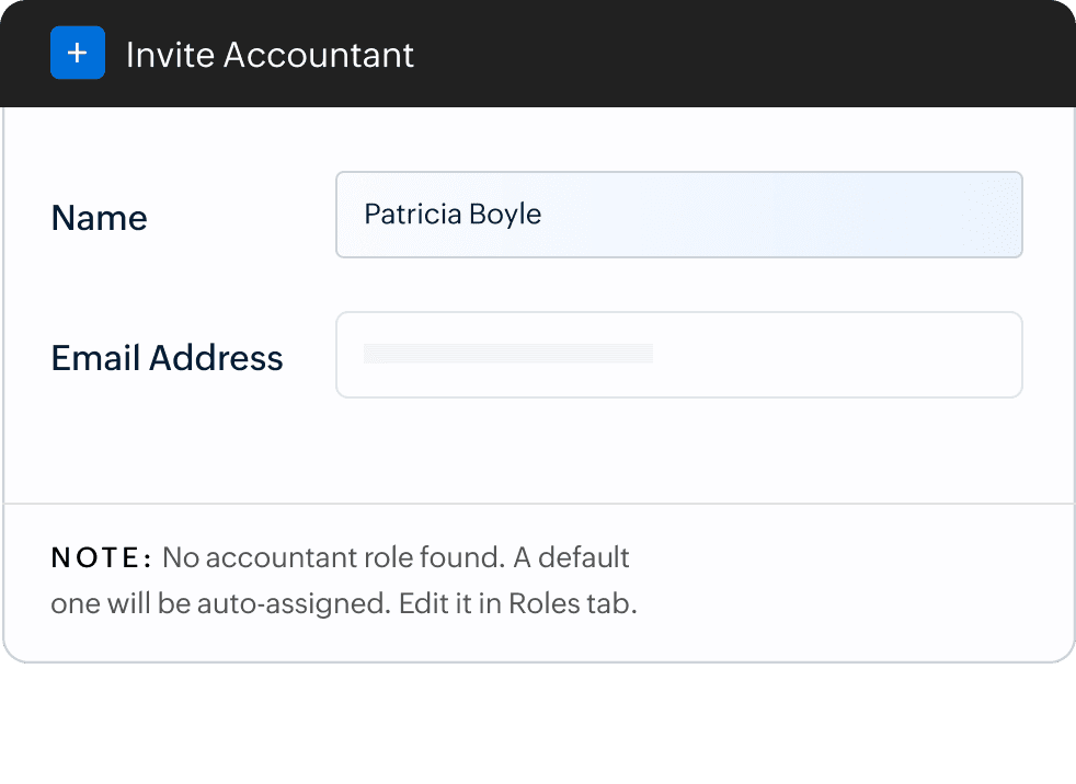Add new users to your Zoho Books organization with secure role-based access to modules and operations. Pick from default roles or create a custom role for every new user.