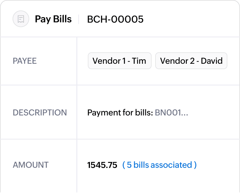 From onboarding vendors and setting up approval workflows to matching purchase orders with bills and reconciling payments, every step is streamlined. Simplify batch payments, reduce manual work, and enhance overall efficiency in managing vendor payables, right from within Zoho Books.