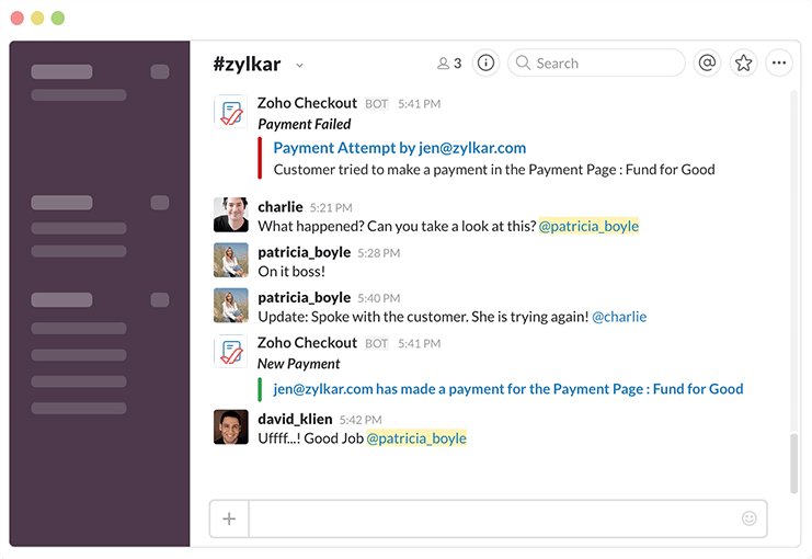When customers try signing up for your services through your Payment Pages and their payment doesn't go through, Zoho Checkout sends a notification to your Slack account.