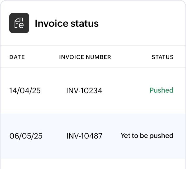 Stay on top of every invoice you've sent or received through InvoiceNow. Zoho Books tracks the transmission status (yet to be pushed, pushed, or failed). This gives you a clear view at all times.