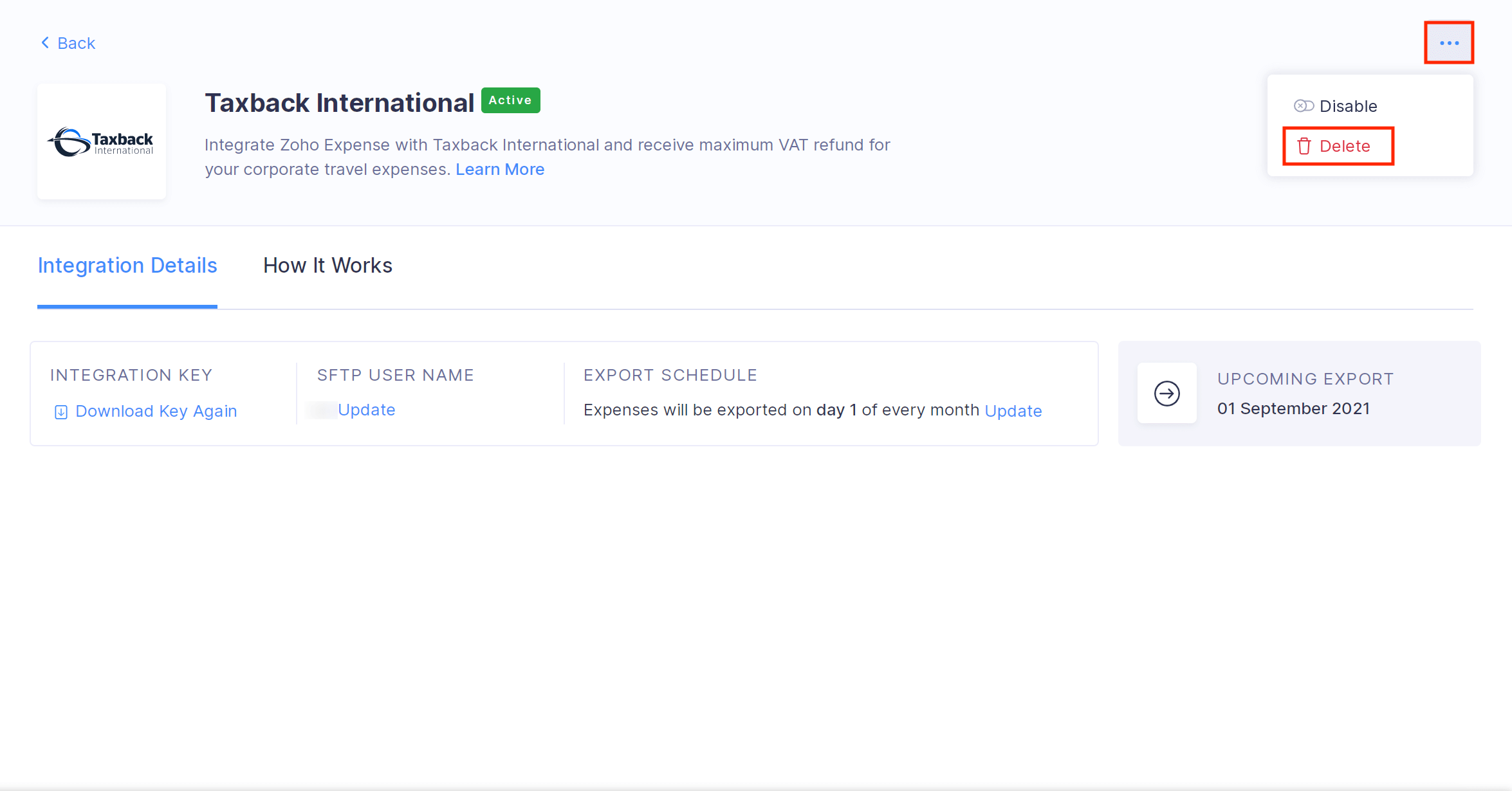 If you want to delete the integration temporarily, you can disable it and the reimbursed expenses will no longer be sent to Taxback International. To disable the integration: