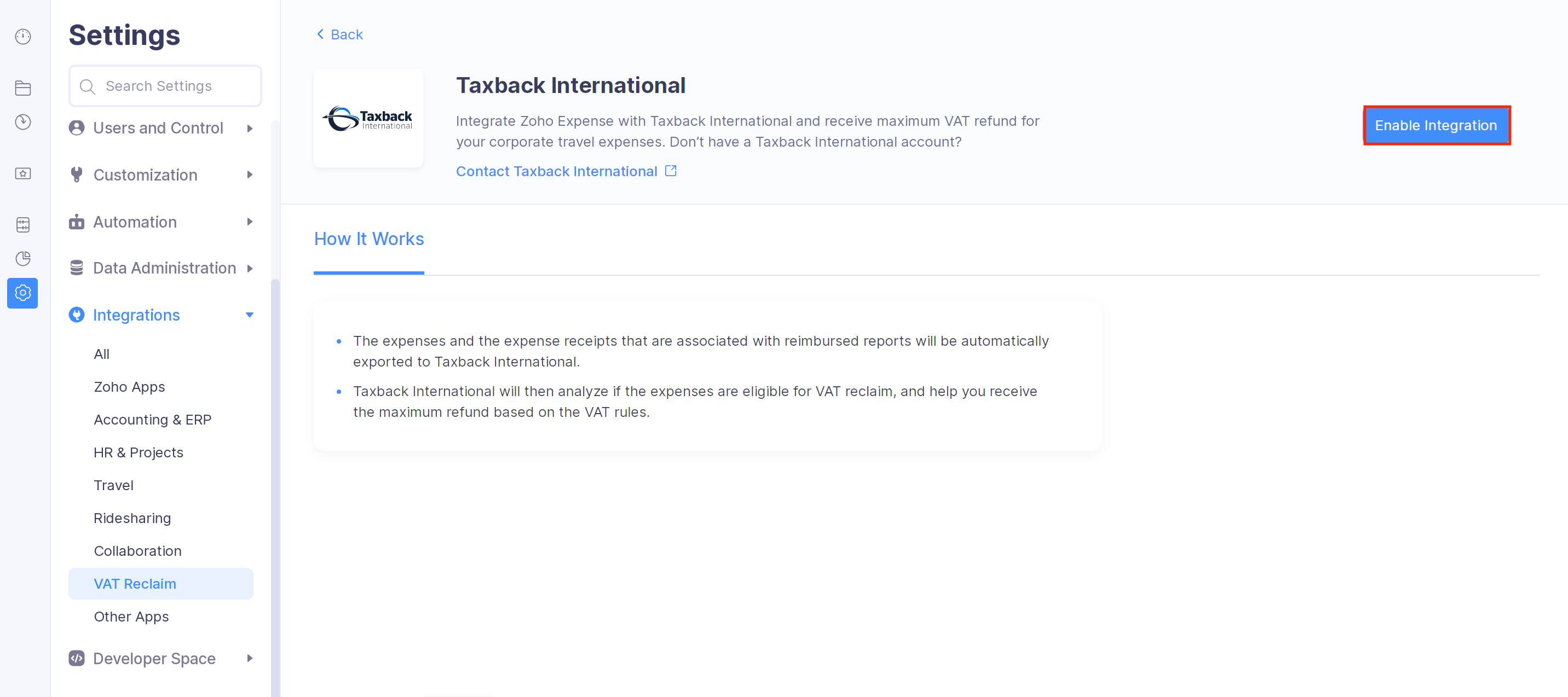 - Click Enable Integration. All your reimbursed expenses will be exported to Taxback International at the set frequency.