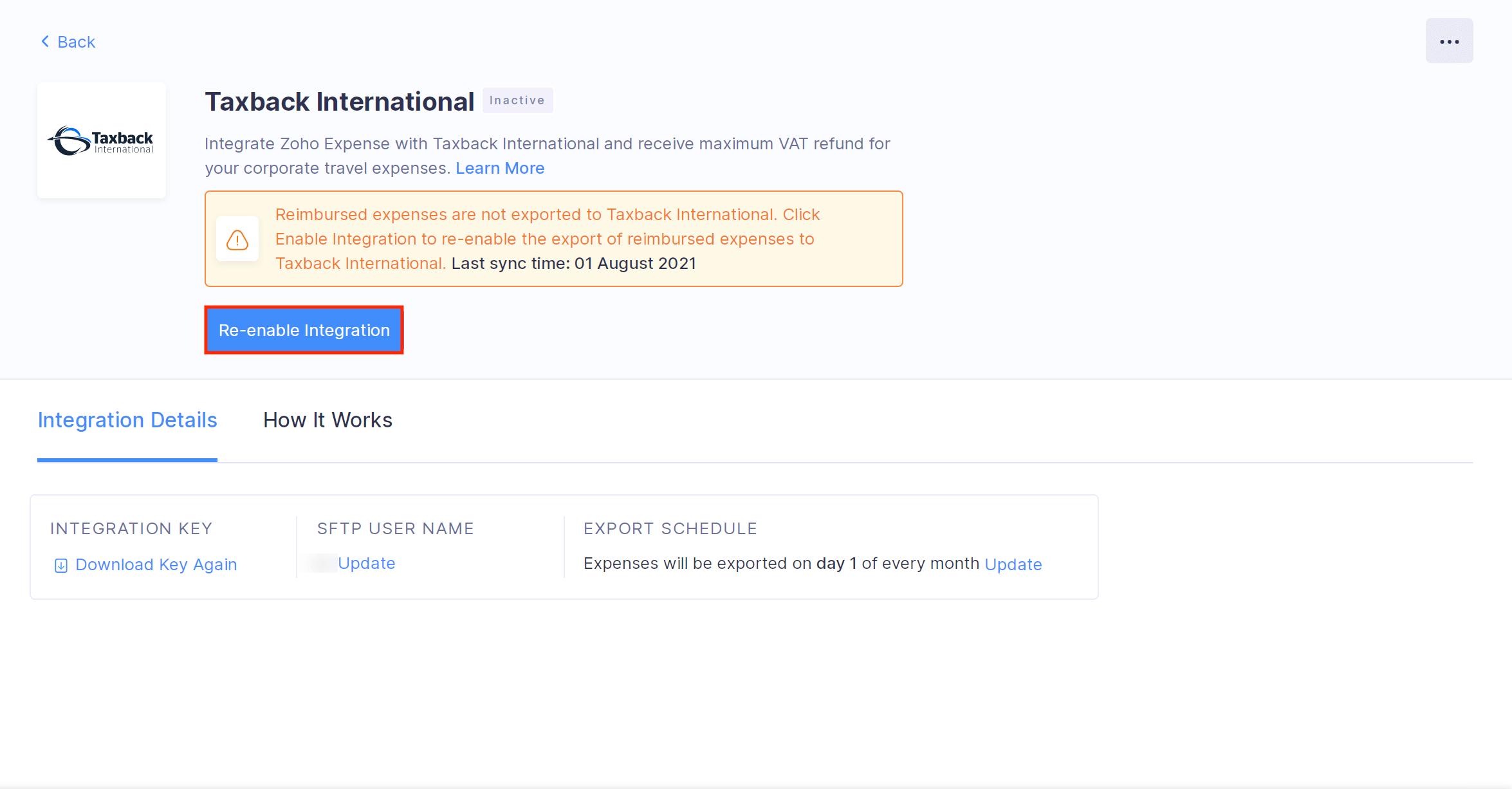 - If you would like to re-enable the integration later, click Re-enable Integration in the Taxback International integration details page.