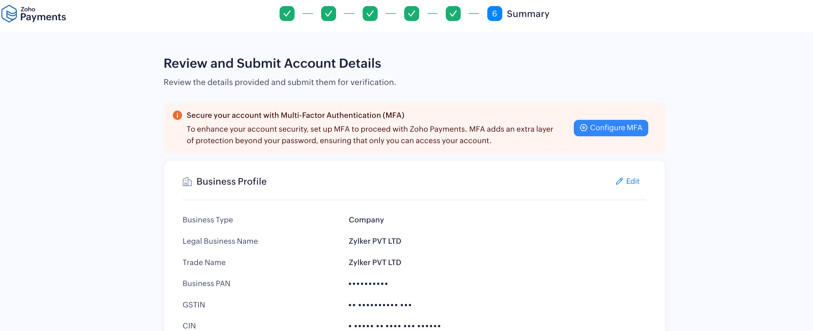 If you haven’t set up MFA for your Zoho account already, you must set it up while creating your Zoho Payments account. To setup MFA:
