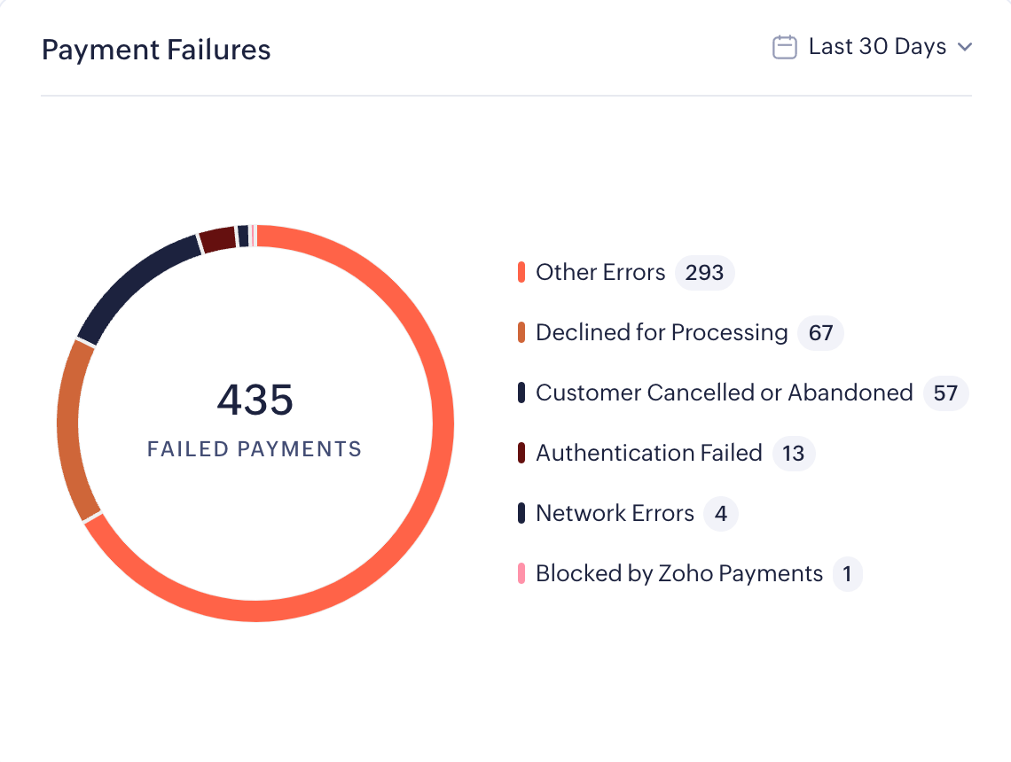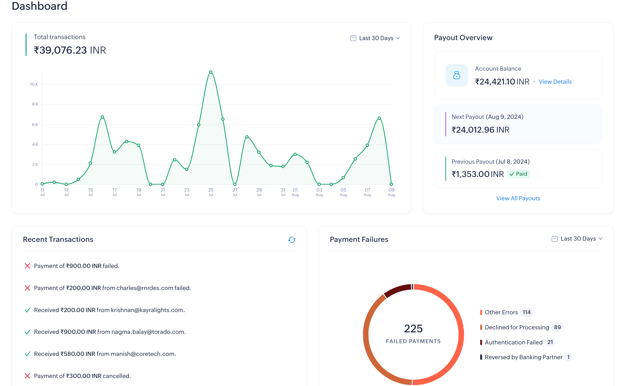 The Payment Failures section shows the number of payments that have failed and the reasons for failure. Payments could’ve failed at the bank’s end, or due to risks, or due to other generic reasons.