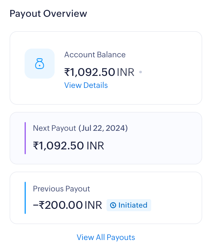 Previous Payout: The amount and date of your previous payout along with its status will be displayed. Click the View All Payouts option for an overview of all the payouts processed through Zoho Payments.
