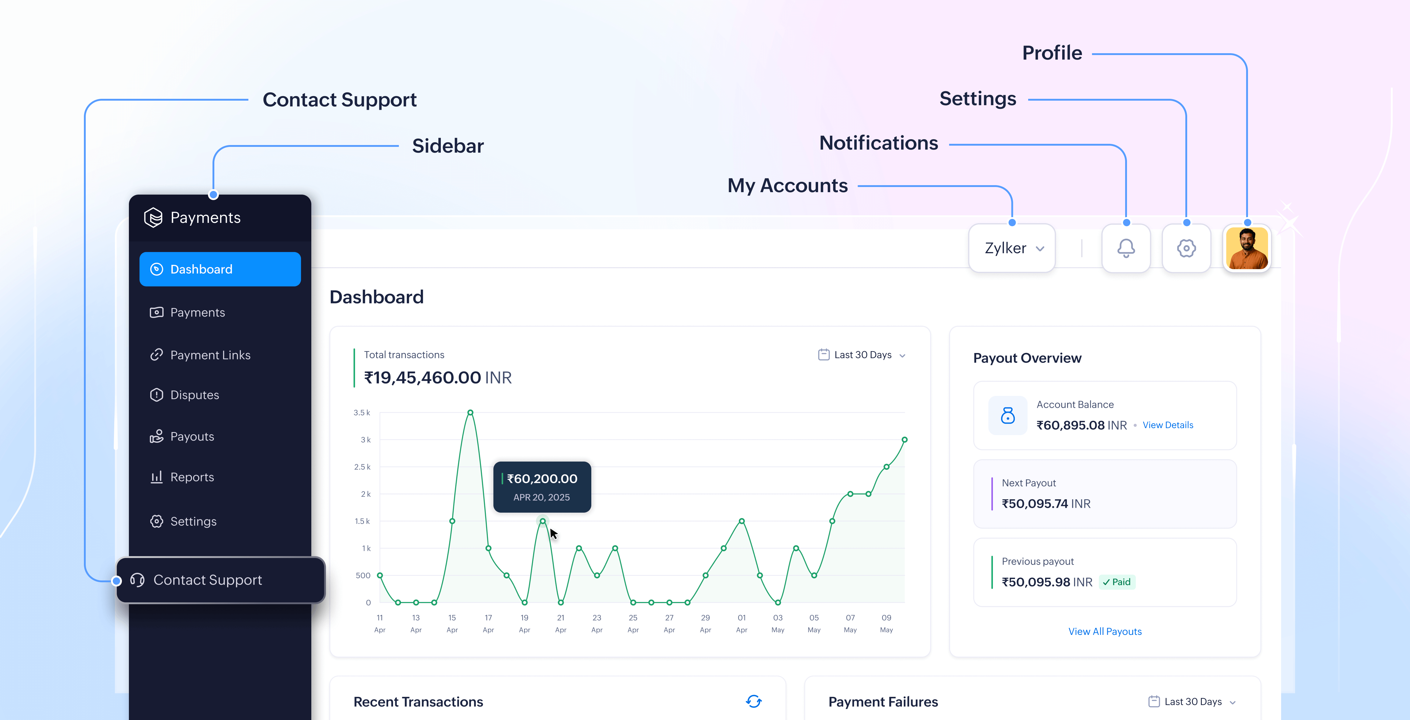 Contact the customer support team, request a call, access user guides, and get in touch with the Zoho Payments team from this section.