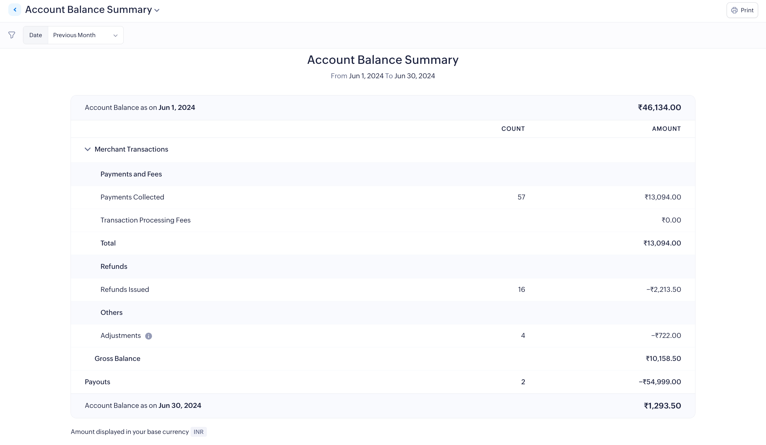 The Account Balance Summary gives a rundown of the balance of funds across all accounts under various categories, such as payments, refunds, and payouts in your Zoho Payments account.