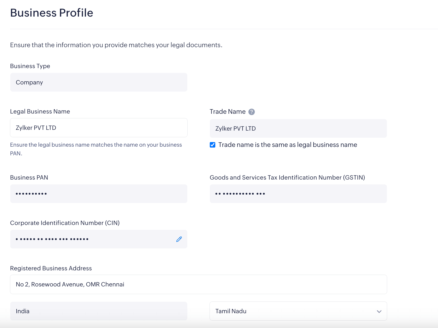 The basic business details that you provided while creating your Zoho Payments account will be displayed here. To view the details:
