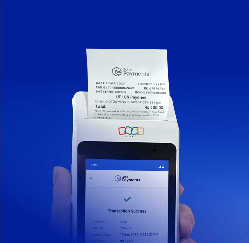Stay in control with the POS device at your counter or through Zoho's Finance apps from your phone or anywhere.