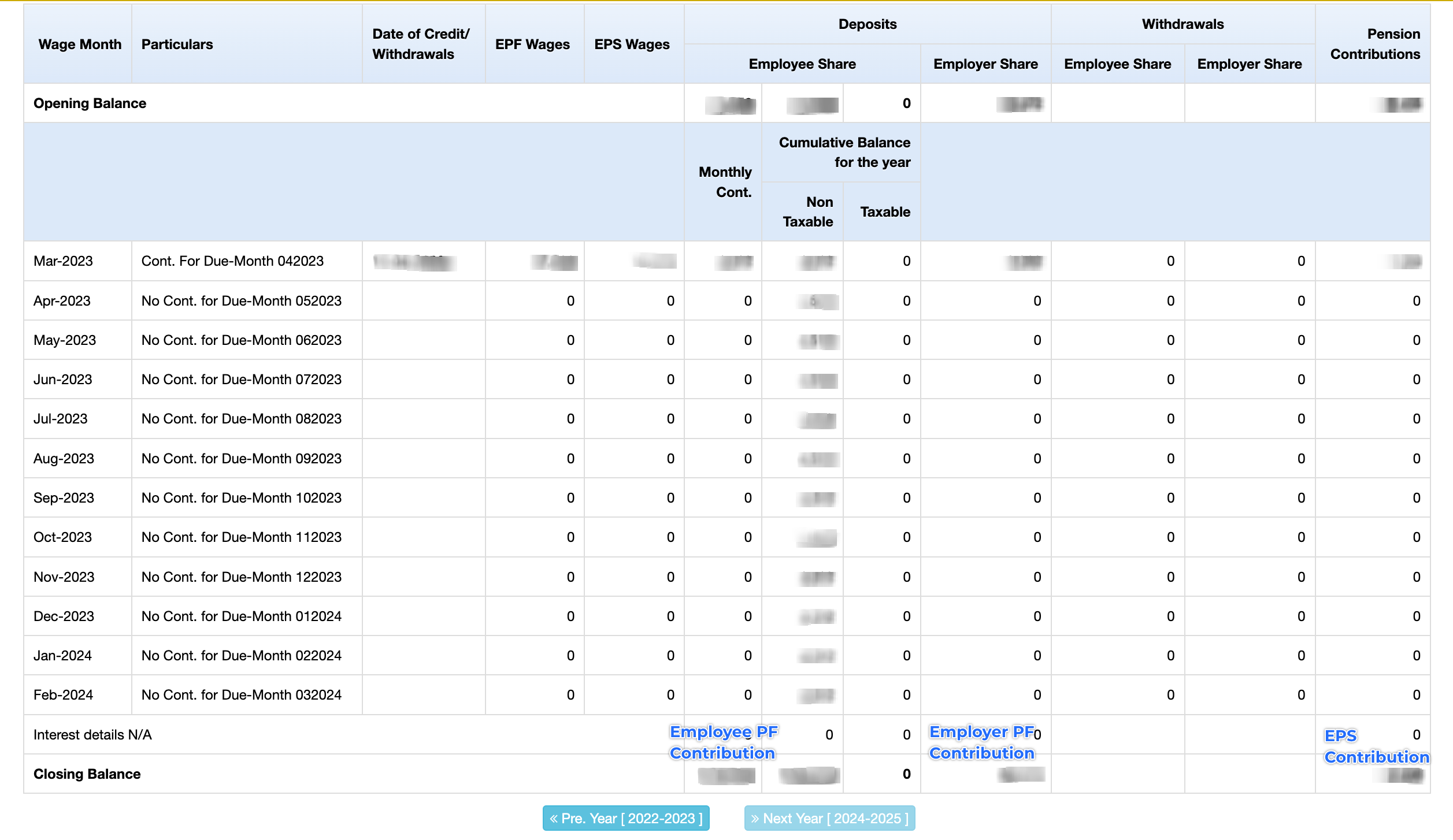 • Enter your employee and employer contribution towards EPF and EPS as per the closing balance mentioned on your EPFO passbook.