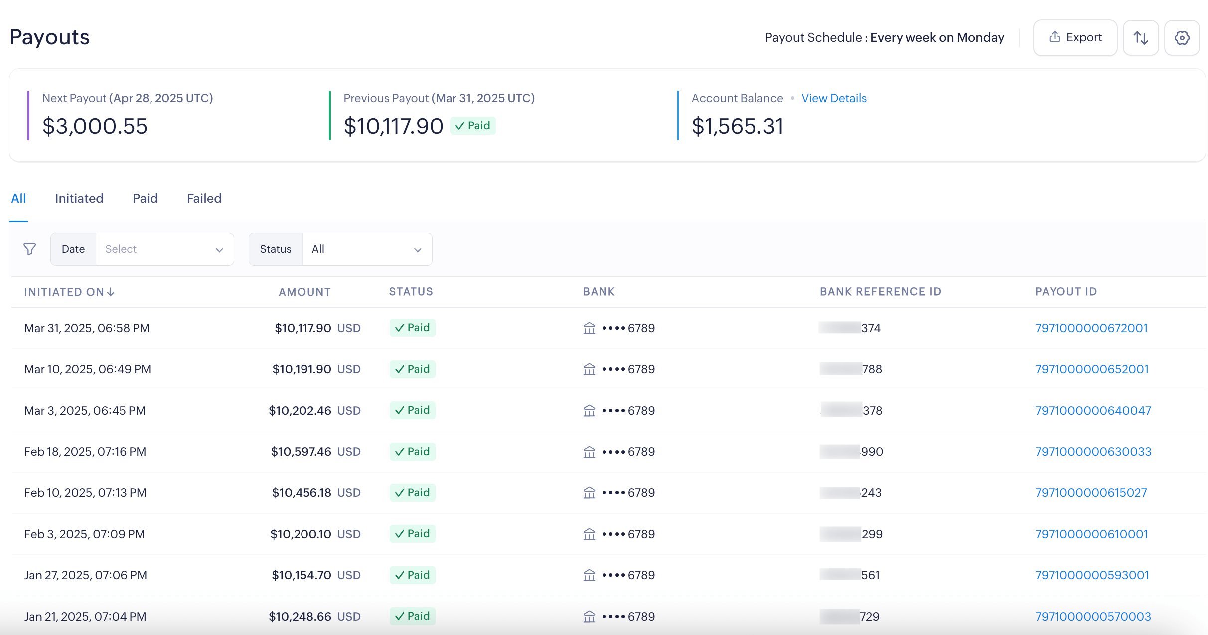 Payouts refer to the sum of money deposited by Zoho Payments to the business’s bank account after receiving payments from your customers. The payout amount is calculated after deducting the transaction processing fees and the refunds you’ve issued.