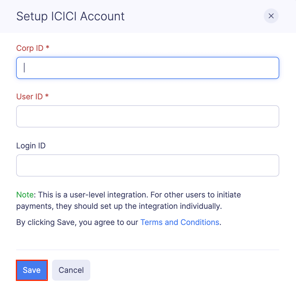 - In the pop-up that opens, enter the Corp ID and User ID of your organisation’s ICICI account.