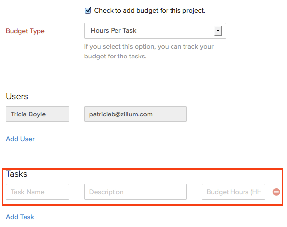 | Tasks | Enter the Tasks that need to be done to complete the project. You can add more tasks by clicking on Add Task. Tasks can also be created later for the project. |