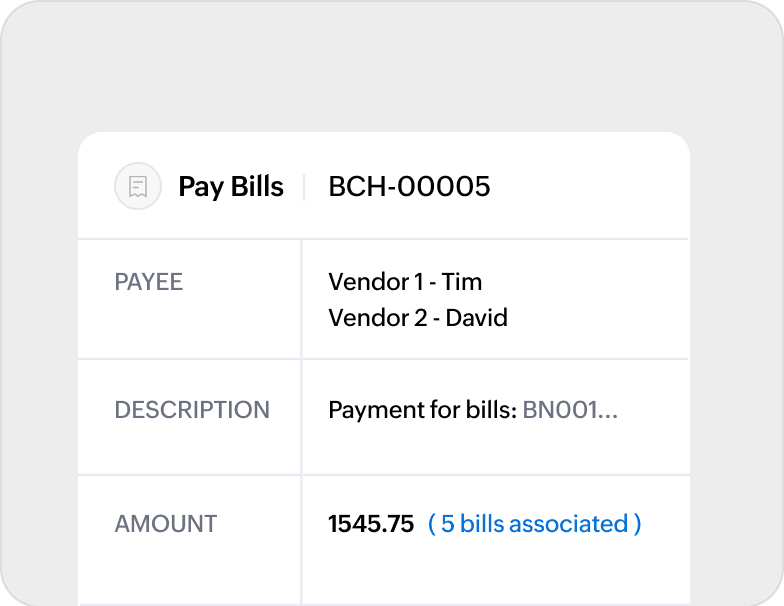 Managing your payables doesn’t have to be complicated. With Zoho Books, you can streamline your entire payable process from onboarding vendors to making payments with just a few clicks.