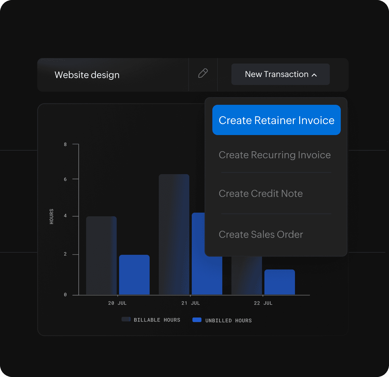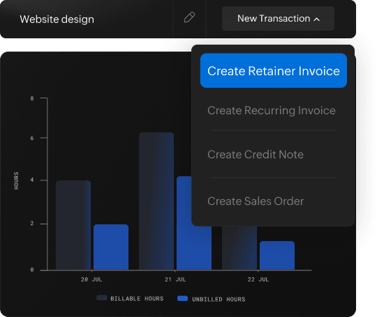Get advance or partial payments by raising retainers directly out of your project dashboard. Apply the amount to the invoices you raise for the project.