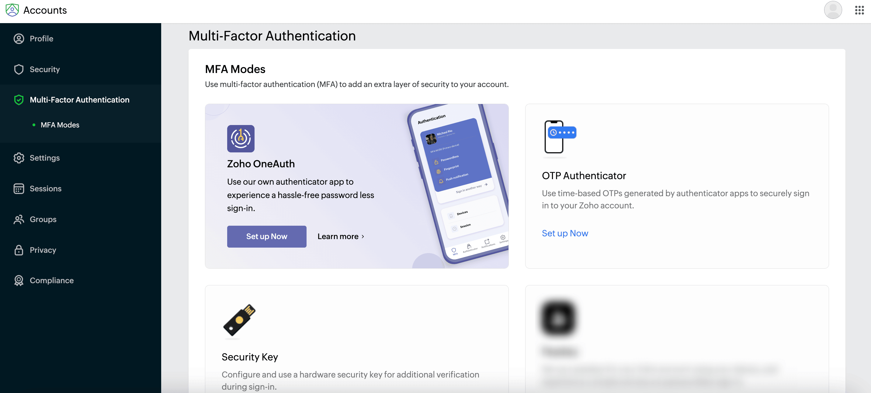 Select the MFA mode you prefer (Zoho OneAuth, OTP Authenticator, or Security Key) and click Set up Now.