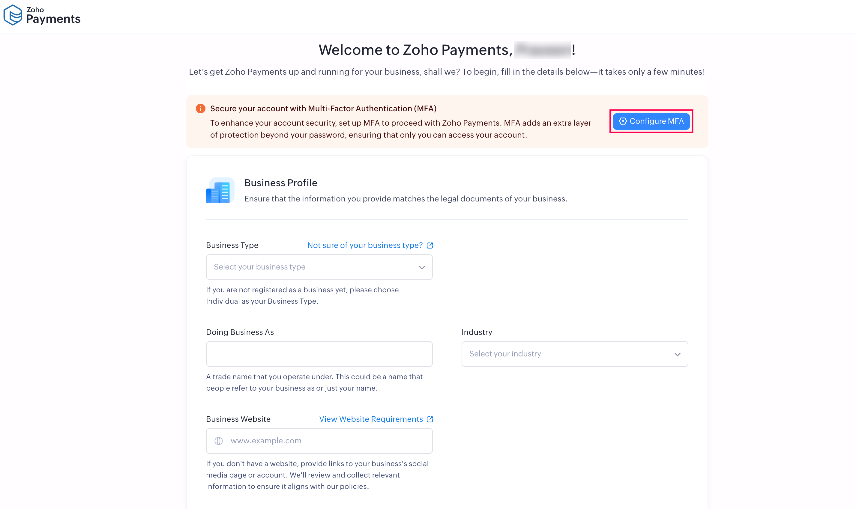 Click Configure MFA while setting up your Zoho Payments account.